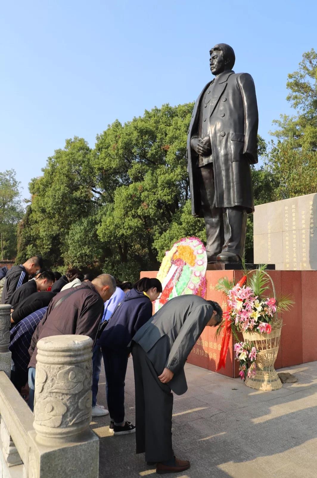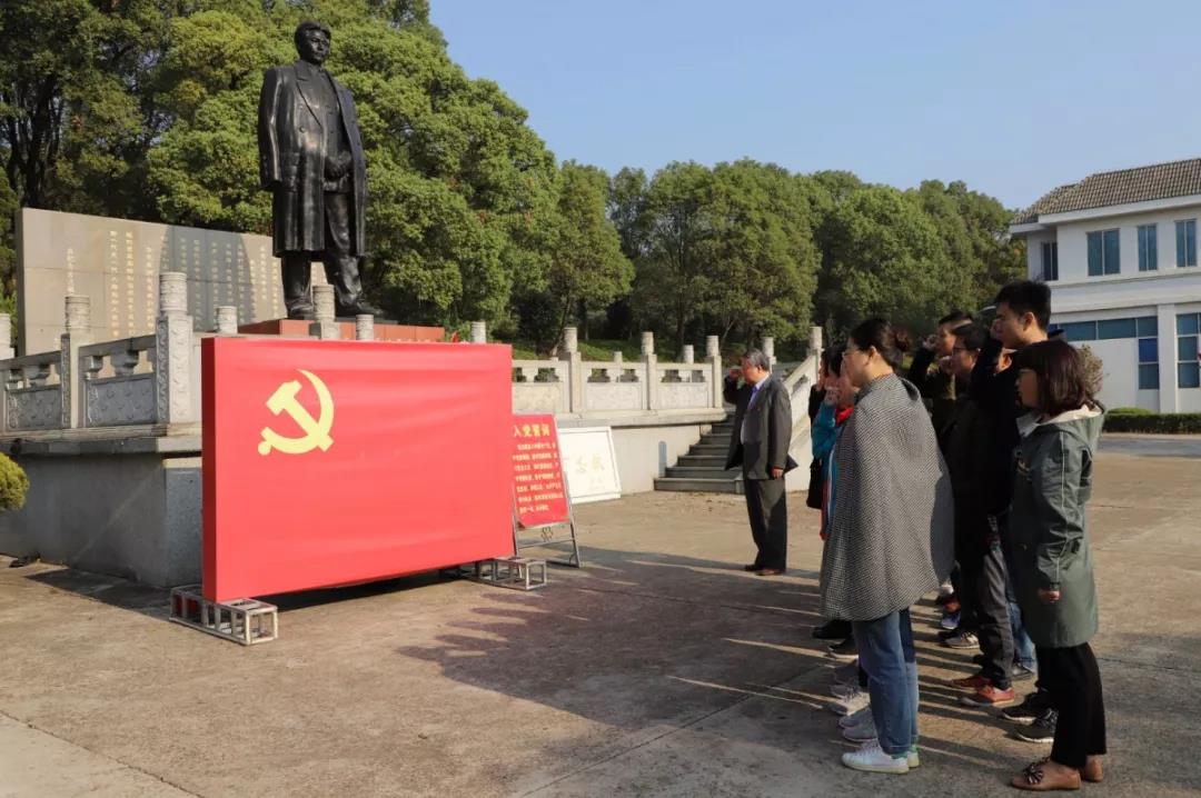 在方志敏铜像前、在鲜红的党旗前,全体党员佩带党徽,庄重举起右拳,重温了入党誓词,并敬献了花圈,肃立默哀。