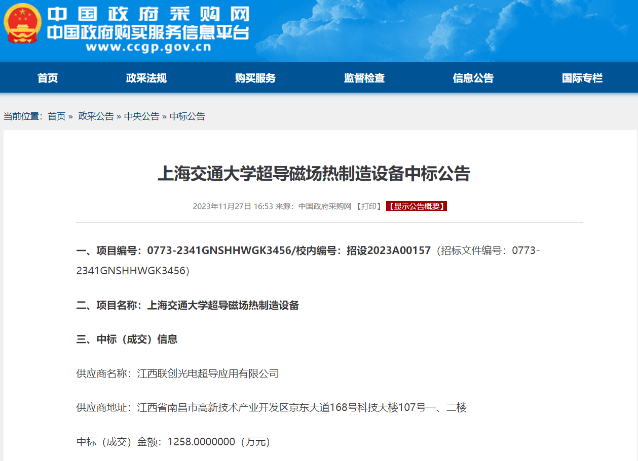 2023年11月27日,联创超导依附领先的手艺优势、优异的信誉以及富厚的项目履历,赢得了评标委员会和上海交通大学向导的一定,顺遂中标“上海交通大学超导磁场热制造装备项目”,项目金额1258万元 。